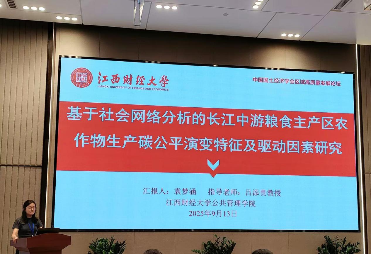 袁梦涵硕士(指导老师:吕添贵教授)在乡村振兴与农业农村现代化分会场进行题为《基于社会网络分析的长江中游粮食主产区农作物生产碳公平演变特征及驱动因素研究》的论文宣讲。汇报聚焦于长江中游粮食主产区农作物生产碳公平的空间关联与协同治理,研究基于2005—2023年区域数据,综合运用修正引力模型与社会网络分析方法,系统构建了碳公平空间关联网络,深入揭示了其结构演变规律与内在驱动机制。该研究提出应整体考虑城市间碳公平的空间关联性,为推动区域农业减排政策的差异化制定与协同实施提供了理论依据与实践路径,报告获得了与会专家的广泛认可,为农业绿色低碳发展提供了新的分析维度和决策支持。