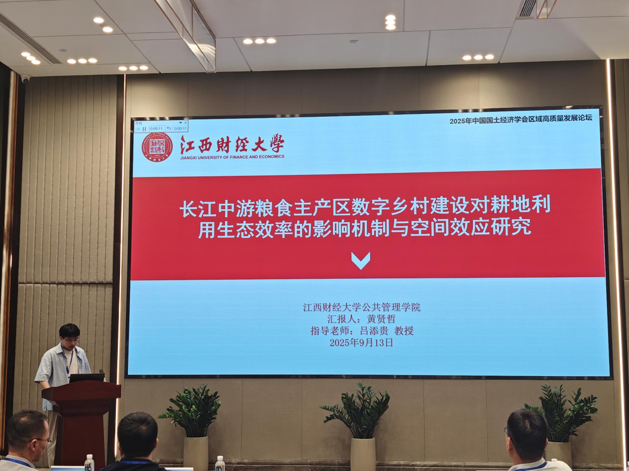 黄贤哲硕士(指导老师:吕添贵教授)在乡村振兴与农业农村现代化分会场进行题为《长江中游粮食主产区数字乡村建设对耕地利用生态效率的影响机制研究——兼论门槛效应与空间效应》的论文宣讲。汇报聚焦于数字乡村建设对耕地利用生态效率的多维影响路径,研究基于2009—2023年长江中游粮食主产区面板数据,综合运用固定效应模型、面板门槛模型、中介效应模型与空间杜宾模型,系统解析了数字乡村建设对耕地生态效率的非线性机制、传导路径及空间溢出效应。该研究为因地制宜制定差异化的数字乡村推进策略、协同提升耕地生态效率提供了扎实的理论依据与政策启示,报告内容引发了会场热烈讨论,并获得了专家们的认可。