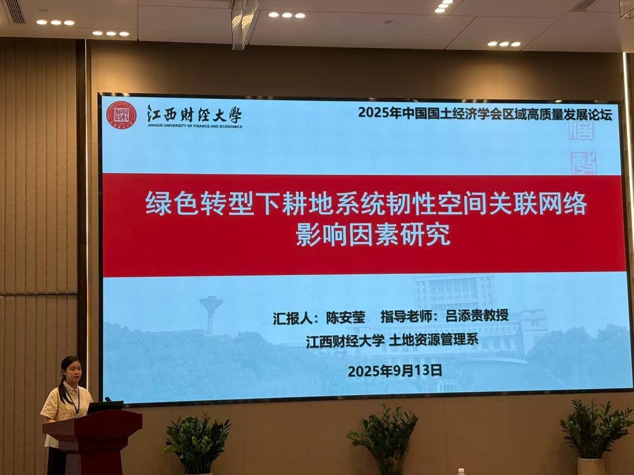 陈安莹硕士(指导老师:吕添贵教授)在乡村振兴与农业农村现代化分会场进行题为《绿色转型下耕地系统韧性空间关联网络影响因素研究》的论文宣讲。汇报聚焦于长江中游粮食主产区耕地系统韧性空间关联网络研究,研究基于K-means改进的熵权法、引力模型、社会网络分析法、QAP 回归模型和地理探测器等多种方法,深入探究2008 —2023年长江中游粮食主产区耕地系统韧性空间网络关联演变与驱动特征。该研究为区域耕地资源的优化管理提供了新思路,有助于推动长江中游粮食主产区耕地系统的可持续利用与高质量发展,报告获得专家们的充分肯定,为后续研究提供了新思路。